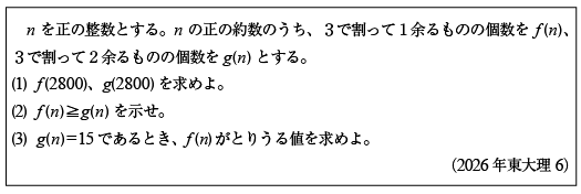 [E]3で割って1余る約数と2余る約数の数の問題(2026年 東大理6)