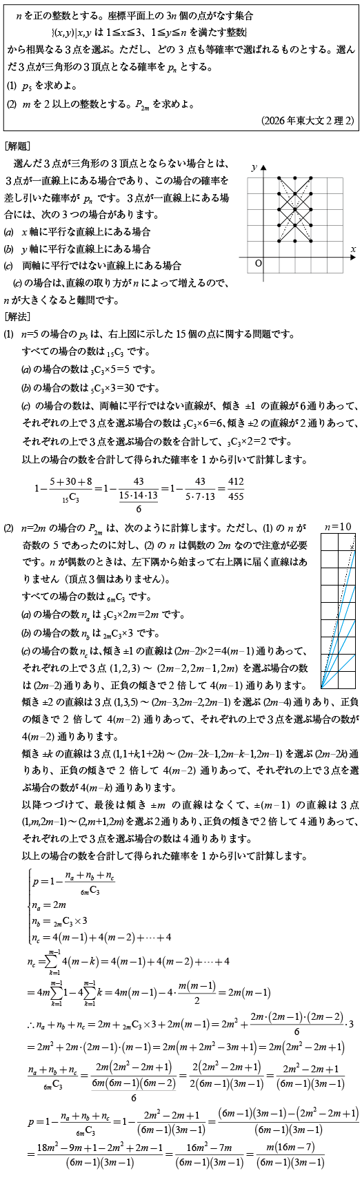 [C]格子点から三角形を作る確率の問題(2026年東大文2理2)