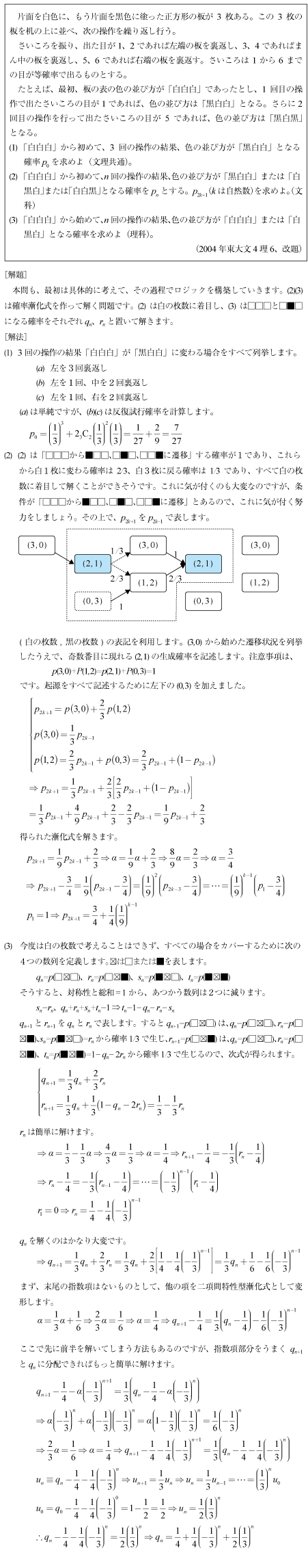 [D]板3枚を裏返す連立漸化式を解くかなり難しい問題(2004年東大文4理6)