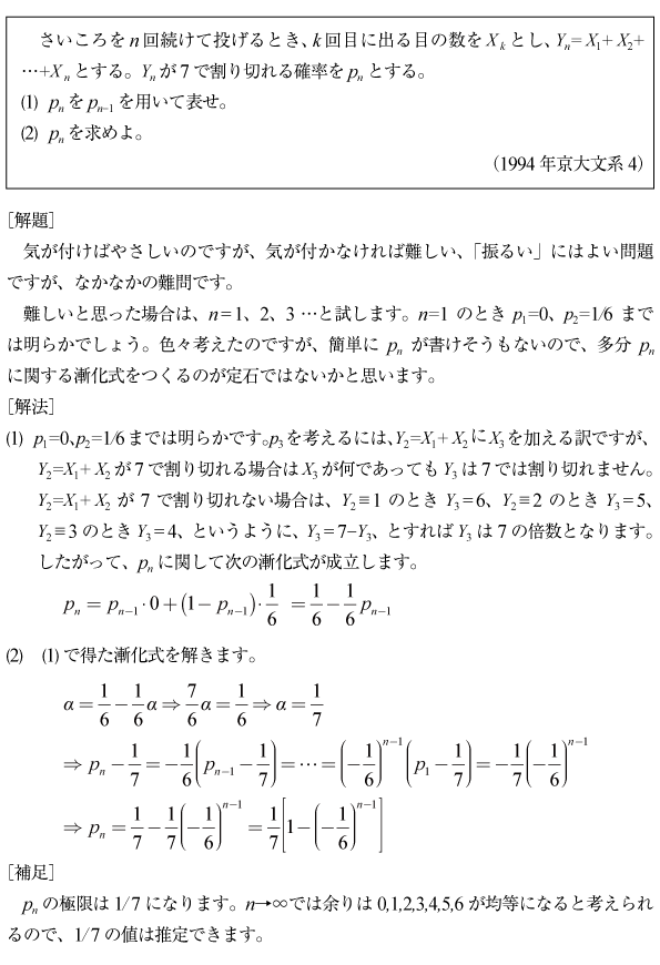 [C]単独確率漸化式を作って解く割り算の問題(1994年京大文系4)