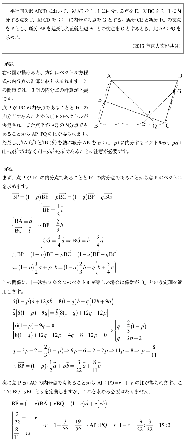 [C]平面図形でベクトル方程式を複数回利用する問題(2013年京大文2理1)