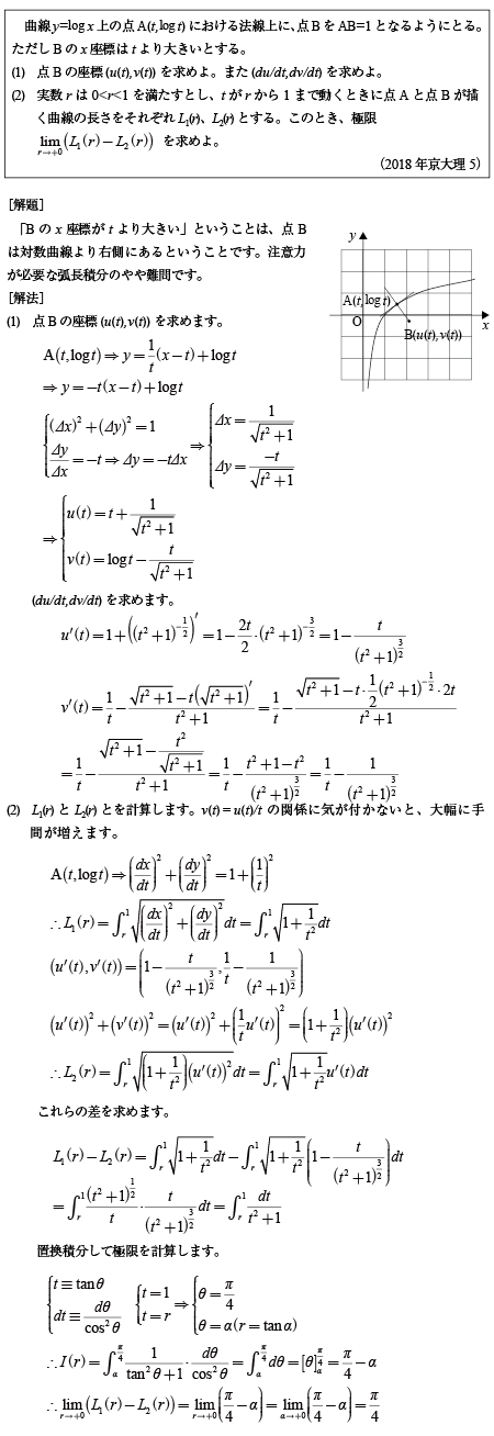 [C]対数関数の線分長の極限計算の問題(2018年京大理系5)