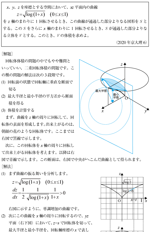 [D]回転体を直交軸の周りに回転した立体の体積の問題(2020年京大理6)