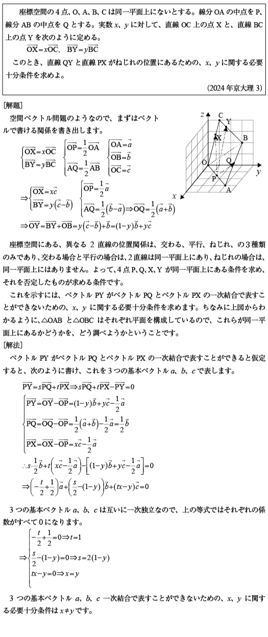 [C]2直線PXがねじれの位置にあるための条件の問題(2024年京大理3)