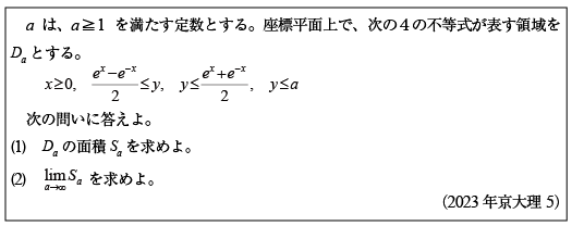 [C]双曲線関数で挟まれた領域の面積の問題(2024年京大理5)