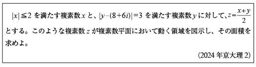 [C]複素数平面上の中点の移動領域の問題(2024年京大理2)