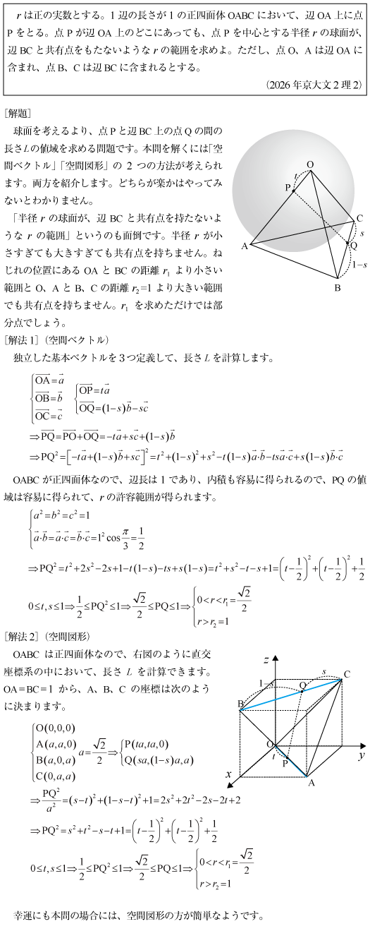 [B]正四面体の対辺距離の問題(2026年京大文2理2)