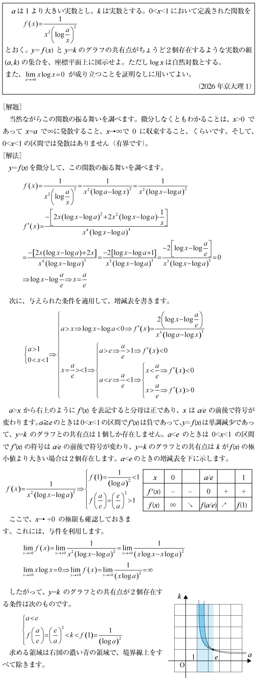 [C]対数分数関数と水平線の交点数の問題(2026年京大理1)