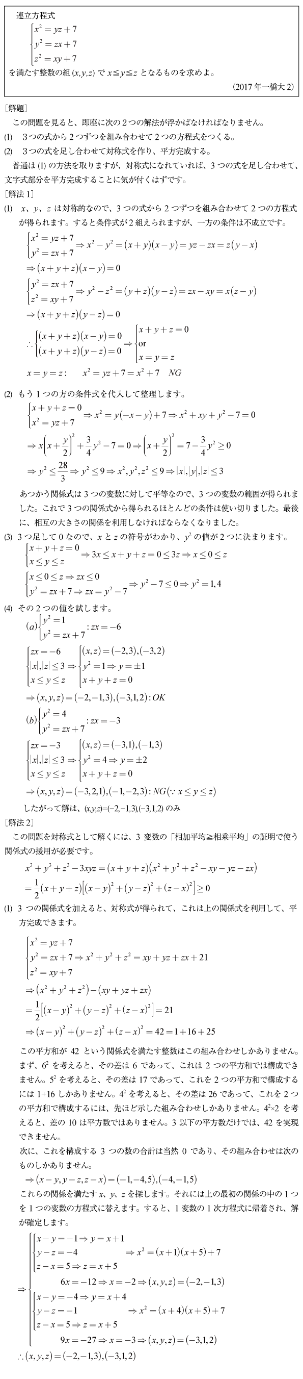 [C]対称型の不定方程式を解く問題(2017年一橋大2)