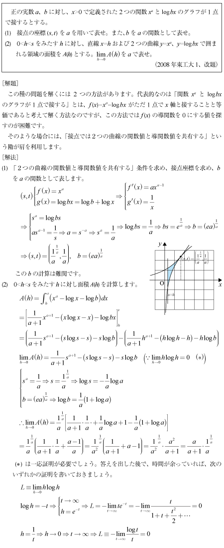 [C]指数・対数関数が接する条件とそれらが囲む領域の面積の問題