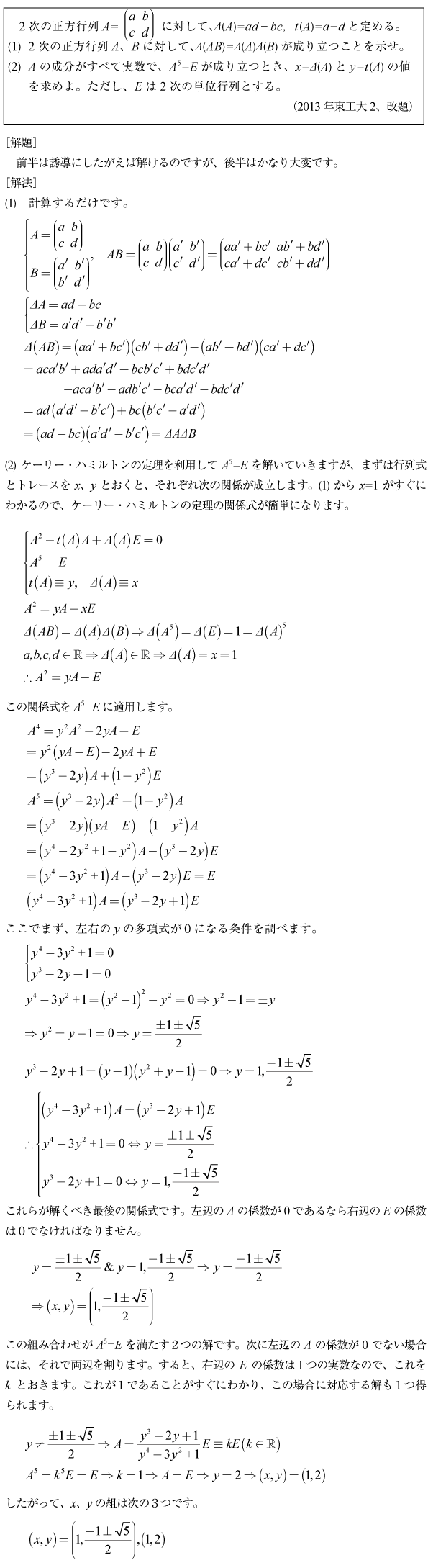 [C]5乗するとEの行列の行列式とトレースの問題(2013年東工大2)