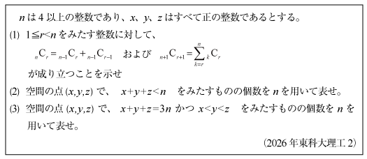 第1問[C]2次・3次の有理数係数有理数方程式の問題(2026年東科大理工1)第2問[C]ホッケースティック恒等式と格子点の係数の問題(2026年東科大理工2)第3問[B]図形と方程式と平面ベクトルのハイブリッド問題(2026年東科大理工3)第4問[D]オイラー形式複素数の数列の問題(2026年東科大理工4)第5問[C]n→∞の極限で残る項の評価の問題(2026年東科大理工5)