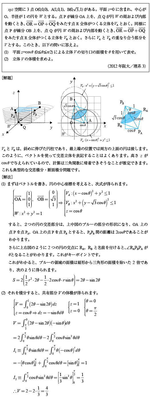 [C]円柱と斜め円柱の共通部分の体積の問題(2012年阪大理系3)
