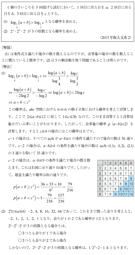 [B]さいころを3回投げる条件充足確率の問題(2013年阪大文系2)
