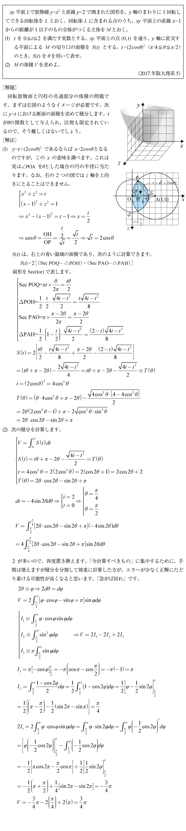 [C]回転放物面と円柱の共通部分の体積の問題(2017年阪大理系5)