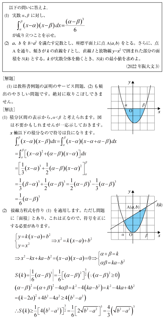 [B]2次関数と弦で囲む領域の面積公式の問題(2022年阪大文3)