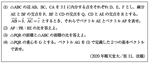 [B]三角形の内分点による三角形のベクトル問題(2020年順天堂大/医11)