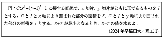[B]円と接線と両軸が囲む領域の面積問題(2024年早大/理工1)
