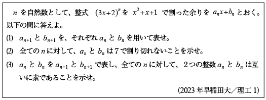 [B]剰余類を使って証明する数式の割り算の数列の問題 (2023年早大/理工1)