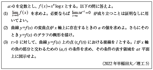 [D]対数関数とxのべき乗の積の関数の振る舞いの問題(2022年早大/理工5) この関数の振る舞いの不思議さには今更ながらに驚きました。