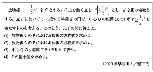 [C]放物線に接する円の中心のy座標の最小値の問題 (2020年早稲田大/理工2)