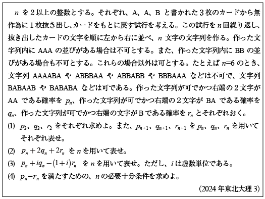 [C]実数・複素数の確率漸化式の問題(2024年東北大理3)