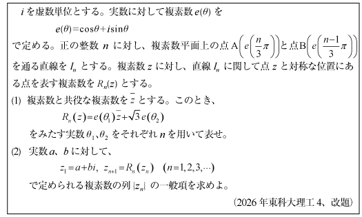 今日は東科大理工から2問です。 [D]オイラー形式複素数の数列の問題(2026年東科大理工4)