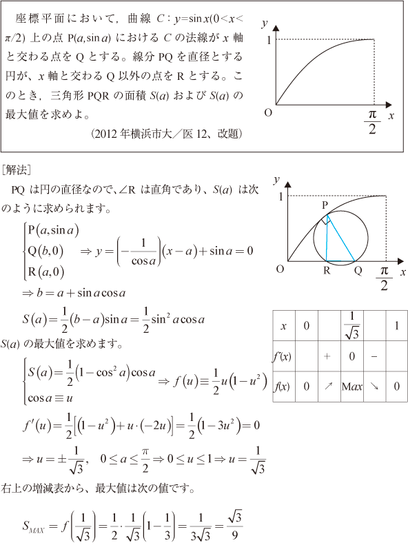 [A]sin関数の法線と三角形の面積の問題(2012年横浜市大/医12)