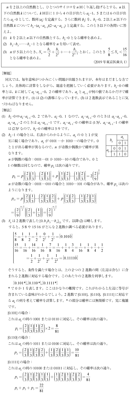 [D]サイコロ確率と2進数を組み合わせた難問(2019年東京医歯大1)