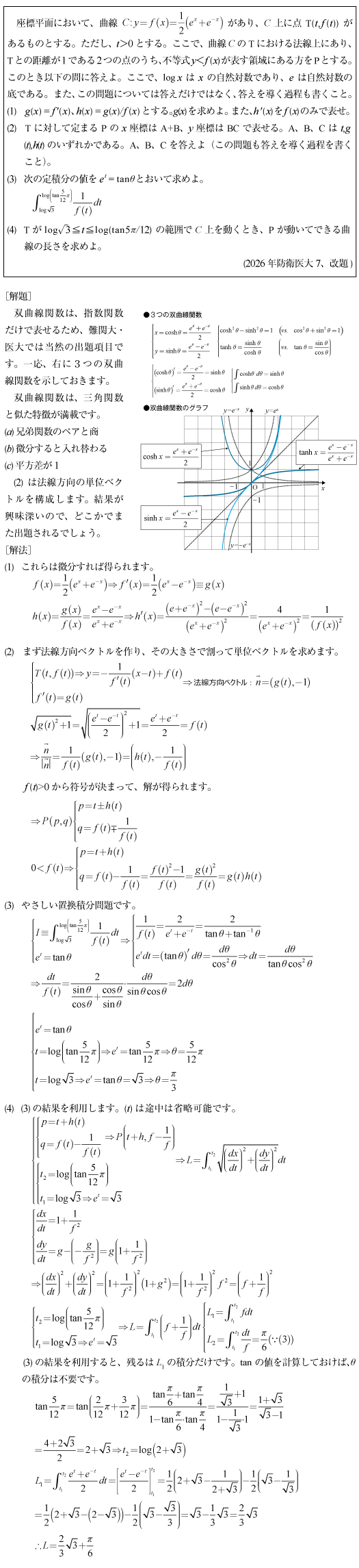 [C]双曲線関数の微積分総合問題(2026年防衛医大7)