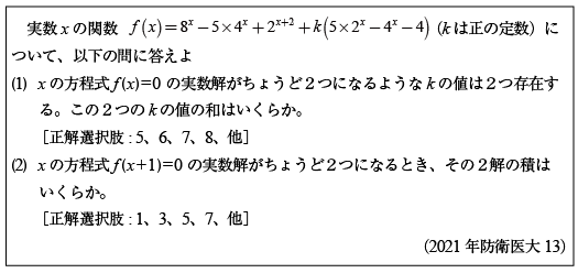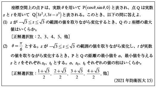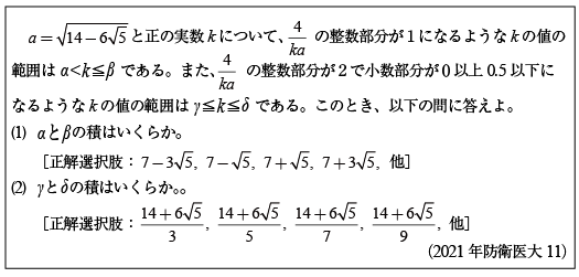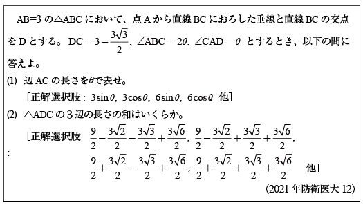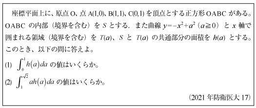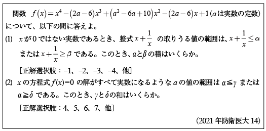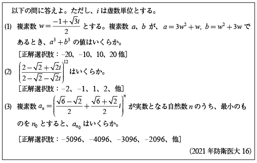 第1問[B]二重根号を外す問題(2021年防衛医大11)第2問[B]三角関数で解く三角形の問題(2021年防衛医大12) 第3問[B]2のべき乗の方程式の問題(2021年防衛医大13)第4問[B]相反方程式の実数解の問題(2021年防衛医大14) 第5問 [C]1変数・2変数関数の値域の問題(2021年防衛医大15)第6問 [C]複素数の計算問題群(2021年防衛医大16)第7問 [C]面積積分の問題(2021年防衛医大17)
