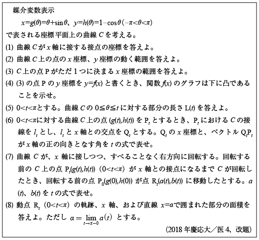 [E]媒介変数表示曲線を回転した曲線と面積の問題