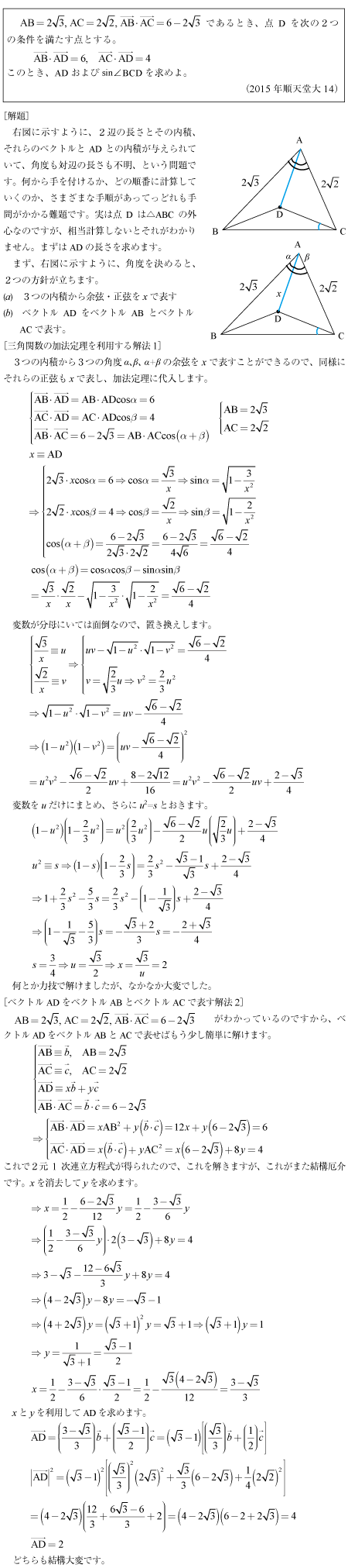 [C]三角形の外接円の半径と角度を求める問題(2015年順天堂大/医14)