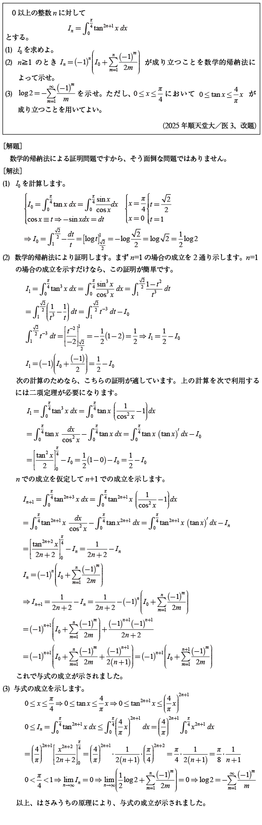 [C]正接積分の数列に関する証明問題(2025年順天堂大/医3)
