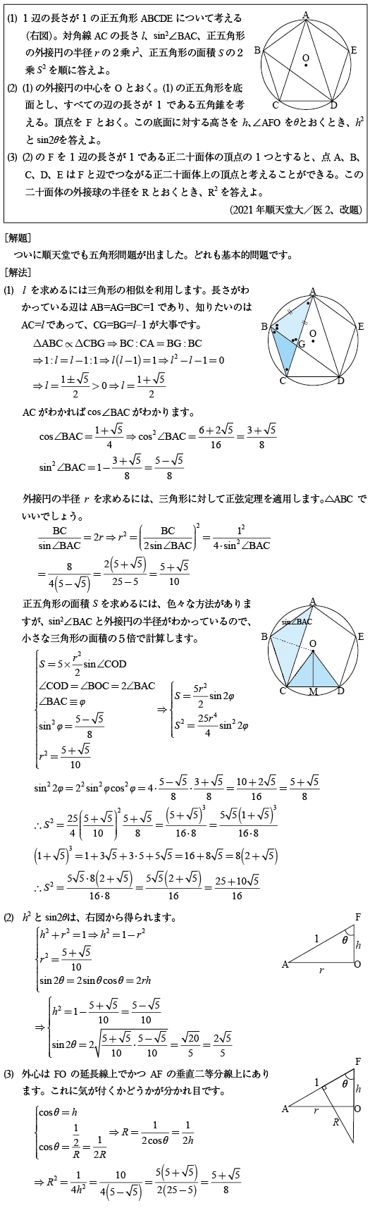 [B]正五角形と正二十面体の問題(2021年順天堂大/医2)