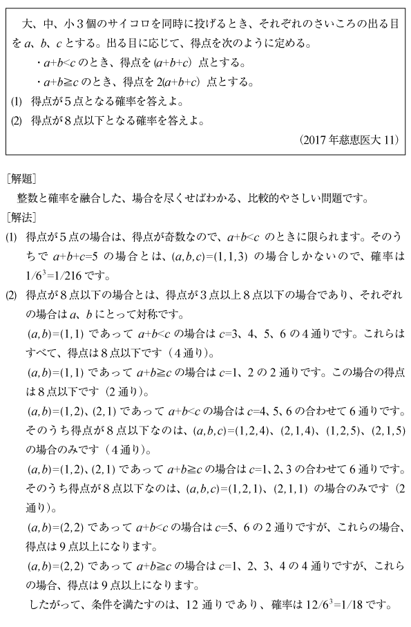 [B]3つのさいころのゲームの確率の問題(2017年慈恵医大11)