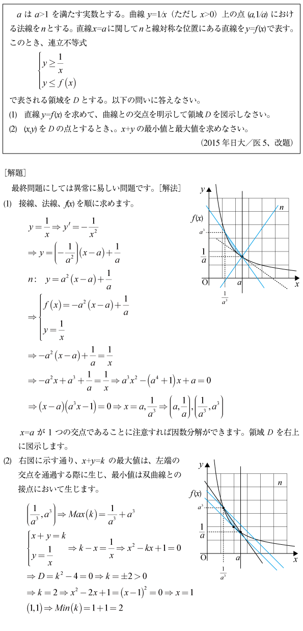 [B]双曲線が囲む領域の非線型計画法の問題(2015年日大/医5)