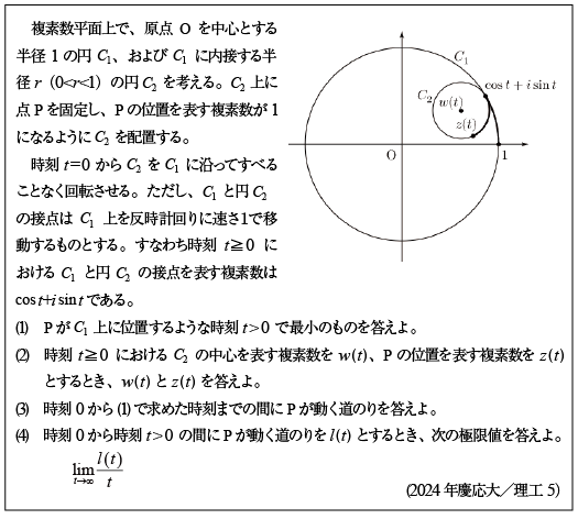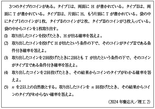 第1問1[B]約数や6乗根のやさしい問題(2024年慶応大/理工11)第1問2[C]数列と不等式の融合問題(2024年慶応大/理工12)第2問[B]条件付き確率の問題(2024年慶応大/理工2)第3問[E]絶対値記号付き積分の微分公式の難問(2024年慶大/理工3) 第4問[B]六面体上の空間ベクトルの問題(2024年慶大/理工4)第5問[C]内サイクロイド曲線の複素数問題(2024年慶大/理工5)