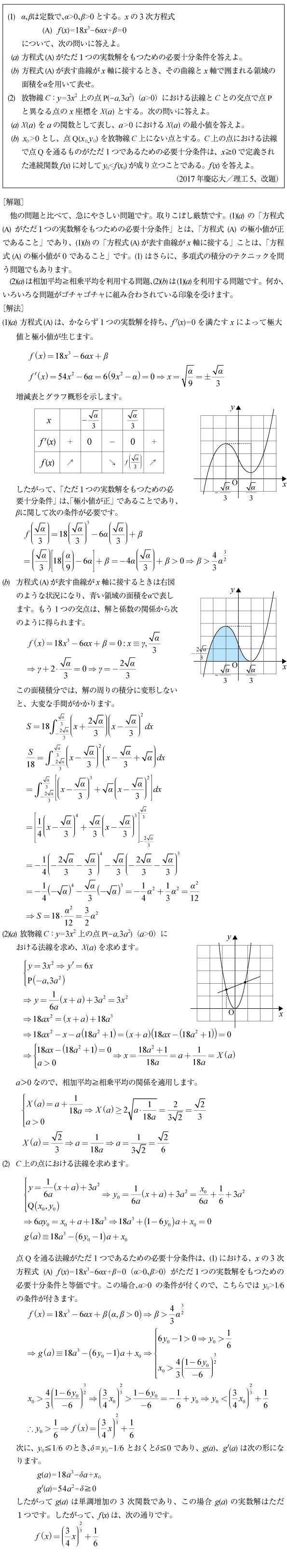 [C]3次関数と法線の問題(2017年慶應大/理工5)