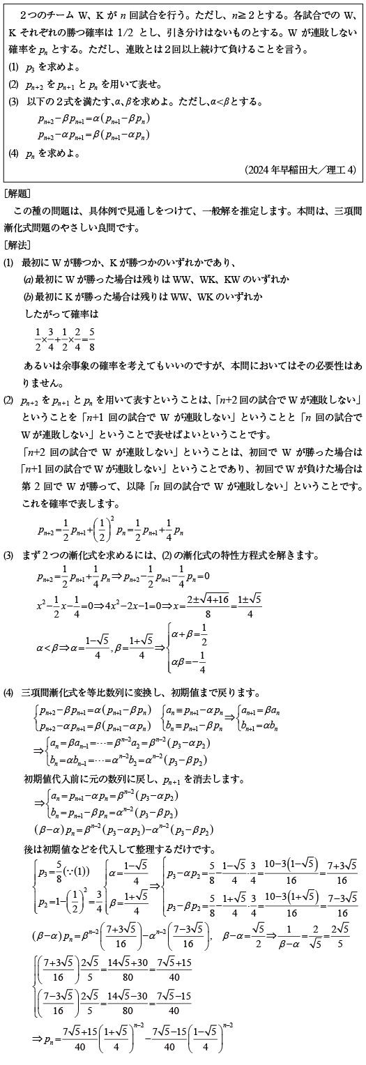[C]連立確率漸化式を解くゲームの問題(2024年早大/理工4)