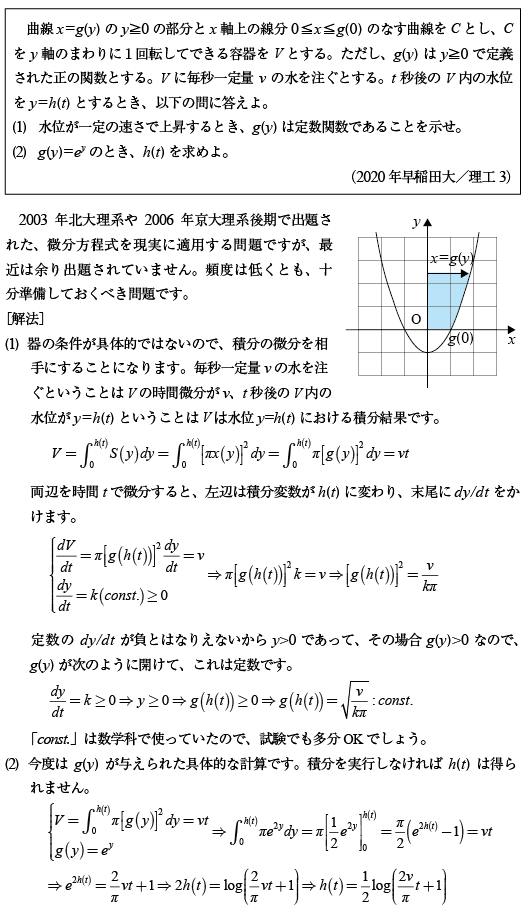 [B]容器に注水する関数方程式の問題(2020年早稲田大/理工3)