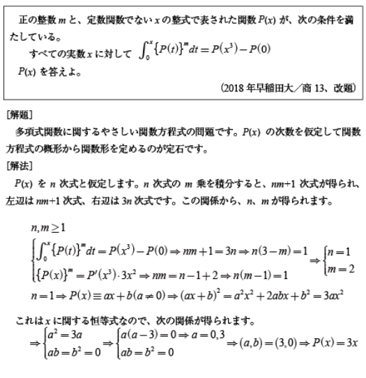 [B]多項式関数に関するやさしい関数方程式問題(2018年早大/商13)
