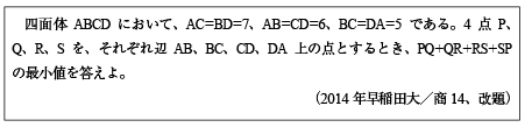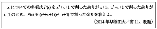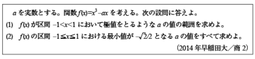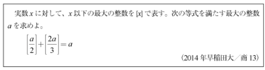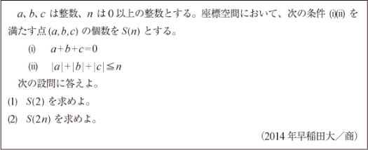 第1問1[B]整式の割り算の典型問題(2014年早大/商11)第1問2[B]微分方程式の問題(2014年早大/商12)第1問3[C]ガウス記号の1次方程式の問題(2014年早大/商13)第1問4[B]合同三角形が構成する四面体の表面上の距離の問題(2014年早大/商14)第2問 [B]3次関数の極値に関する問題(2014年早大/商2)第3問 [C]空間格子点の数を数える問題(2014年早大/商3)