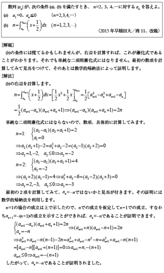 [C]数学的帰納法によって証明する漸化式問題(2015年早大/商11)