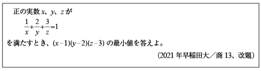 [B]3変数式の制限付き最小値の問題(2021年早大/商13)