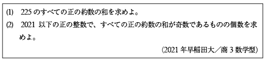 [B]約数の和が奇数となる自然数の数の問題(2021年早大/商 数学型3)