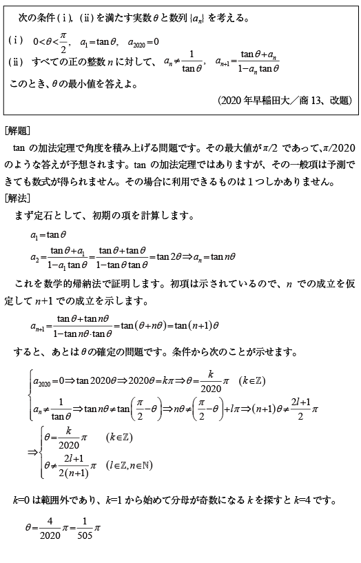 [B]三角関数数列の最小角度の問題(2020年早大/商13)