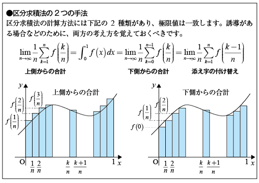 x座標は原点の0から順に1/nずつ増えていくので、曲線の内側から計算する方法では高さはf(0)からn個、総和はk=0からn-1のn個、曲線の外側から計算する方法では高さはf(1/n)からn個、総和はk=1からnのn個です。