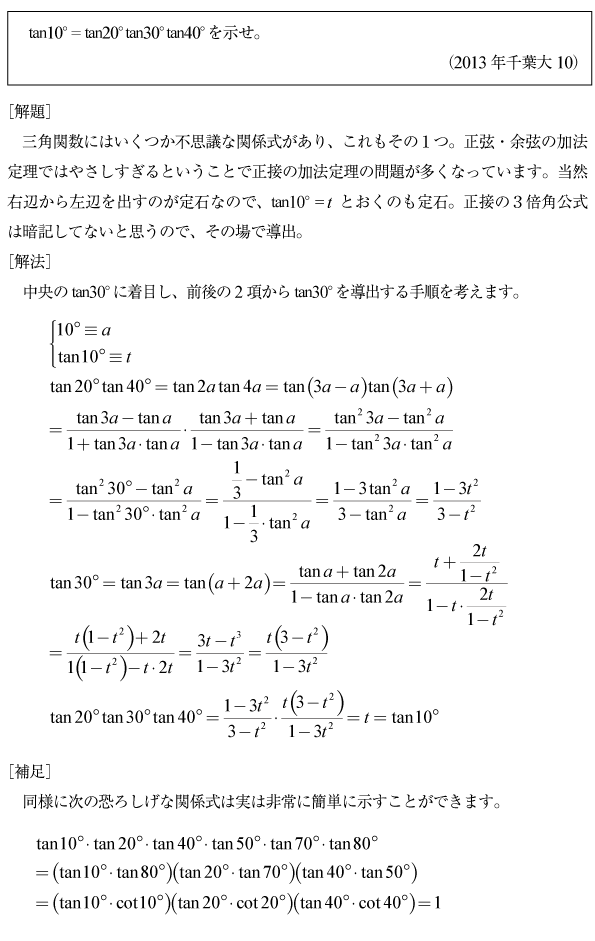[B]tan10°= tan20°tan30°tan40°の証明の問題(2013年千葉大10)