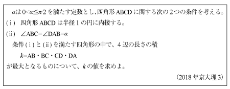 [C]円内接等脚台形に関する三角関数問題(2018年京大理系3)